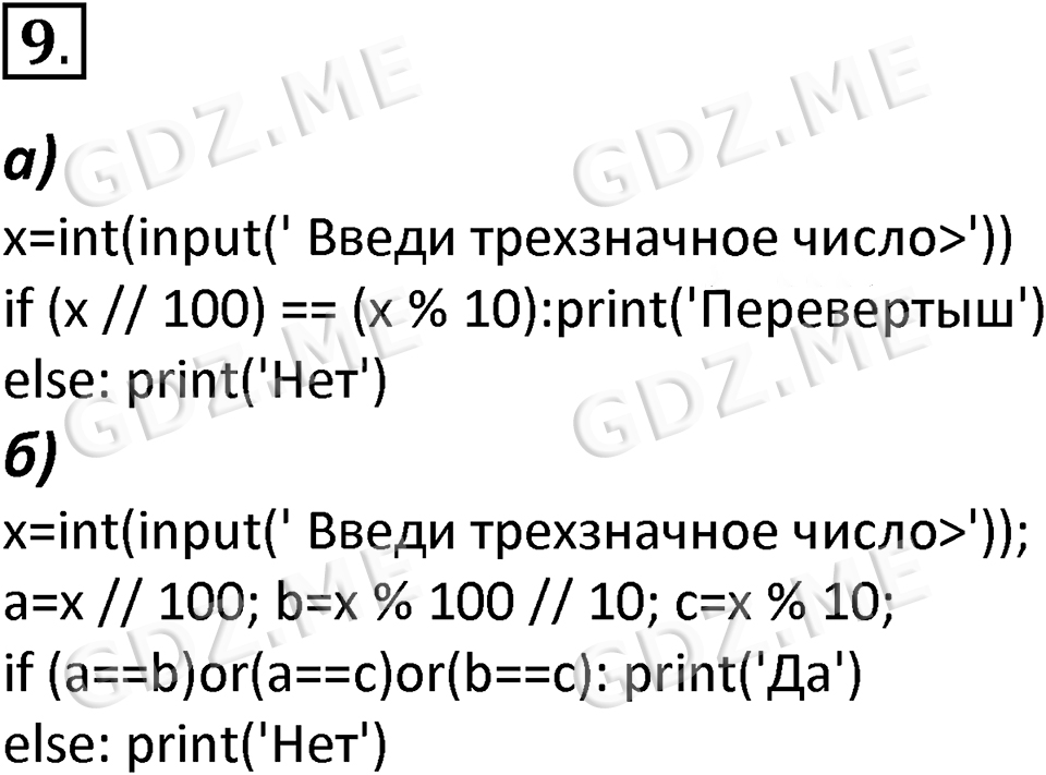 Подробный вариант решения из решебника (ГДЗ): Номер номер 9 (НОМЕРА РЕШЕНИЙ. §5.4. Программирование разветвляющихся алгоритмов. Страницы 238-242. Вопросы и задания) по предмету 8 класс, за , авторы учебника Босова.