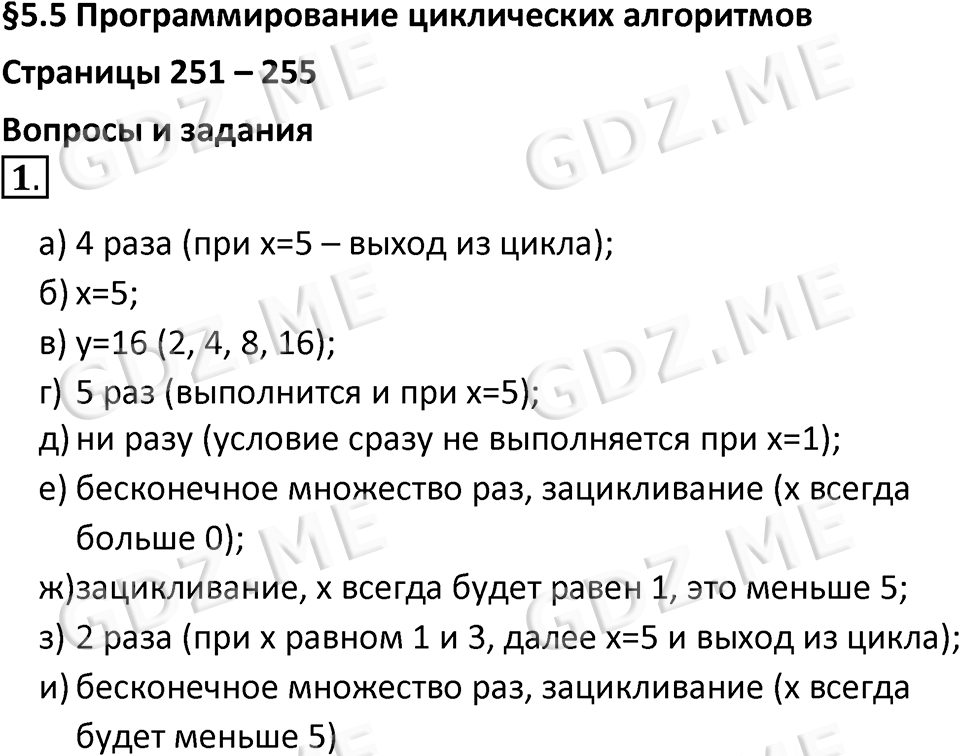 Подробный вариант решения из решебника (ГДЗ): Номер номер 1 (НОМЕРА РЕШЕНИЙ. §5.5. Программирование циклических алгоритмов. Страницы 251-255. Вопросы и задания) по предмету 8 класс, за , авторы учебника Босова.