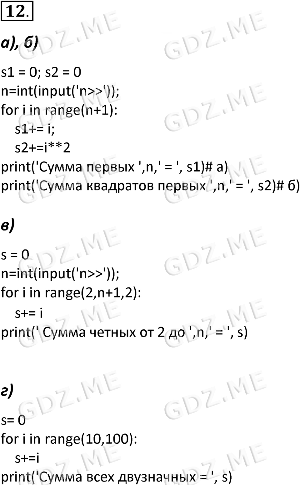 Подробный вариант решения из решебника (ГДЗ): Номер номер 12 (НОМЕРА РЕШЕНИЙ. §5.5. Программирование циклических алгоритмов. Страницы 251-255. Вопросы и задания) по предмету 8 класс, за , авторы учебника Босова.
