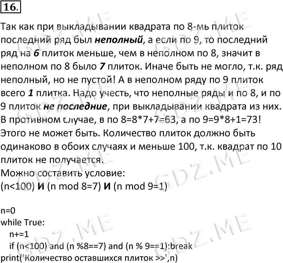 Подробный вариант решения из решебника (ГДЗ): Номер номер 16 (НОМЕРА РЕШЕНИЙ. §5.5. Программирование циклических алгоритмов. Страницы 251-255. Вопросы и задания) по предмету 8 класс, за , авторы учебника Босова.