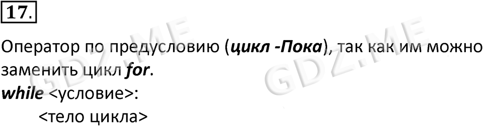 Подробный вариант решения из решебника (ГДЗ): Номер номер .17 (НОМЕРА РЕШЕНИЙ. §5.5. Программирование циклических алгоритмов. Страницы 251-255. Вопросы и задания) по предмету 8 класс, за , авторы учебника Босова.