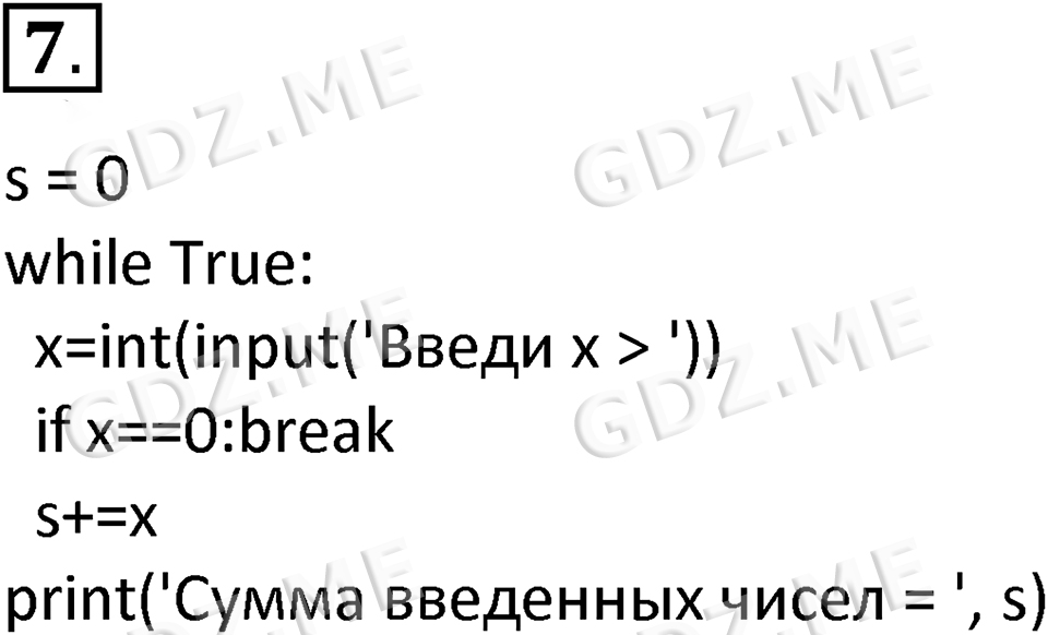 Подробный вариант решения из решебника (ГДЗ): Номер номер 7 (НОМЕРА РЕШЕНИЙ. §5.5. Программирование циклических алгоритмов. Страницы 251-255. Вопросы и задания) по предмету 8 класс, за , авторы учебника Босова.