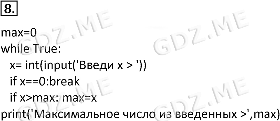 Подробный вариант решения из решебника (ГДЗ): Номер номер 8 (НОМЕРА РЕШЕНИЙ. §5.5. Программирование циклических алгоритмов. Страницы 251-255. Вопросы и задания) по предмету 8 класс, за , авторы учебника Босова.