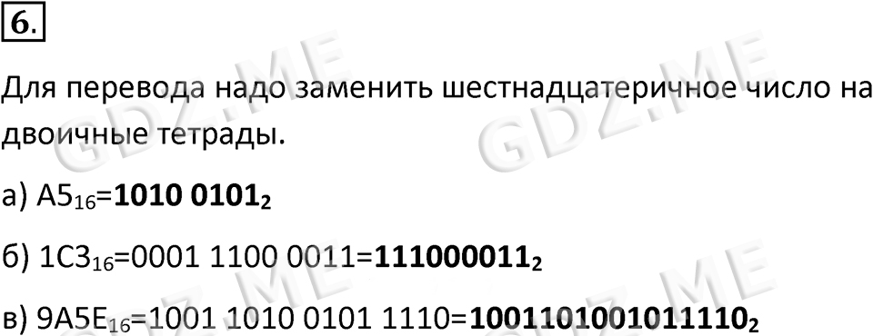 Подробный вариант решения из решебника (ГДЗ): Номер номер 6 (НОМЕРА РЕШЕНИЙ. §1.3. Системы счисления, родственные двоичной. Страницы 28-30. Вопросы и задания) по предмету 8 класс, за , авторы учебника Босова.