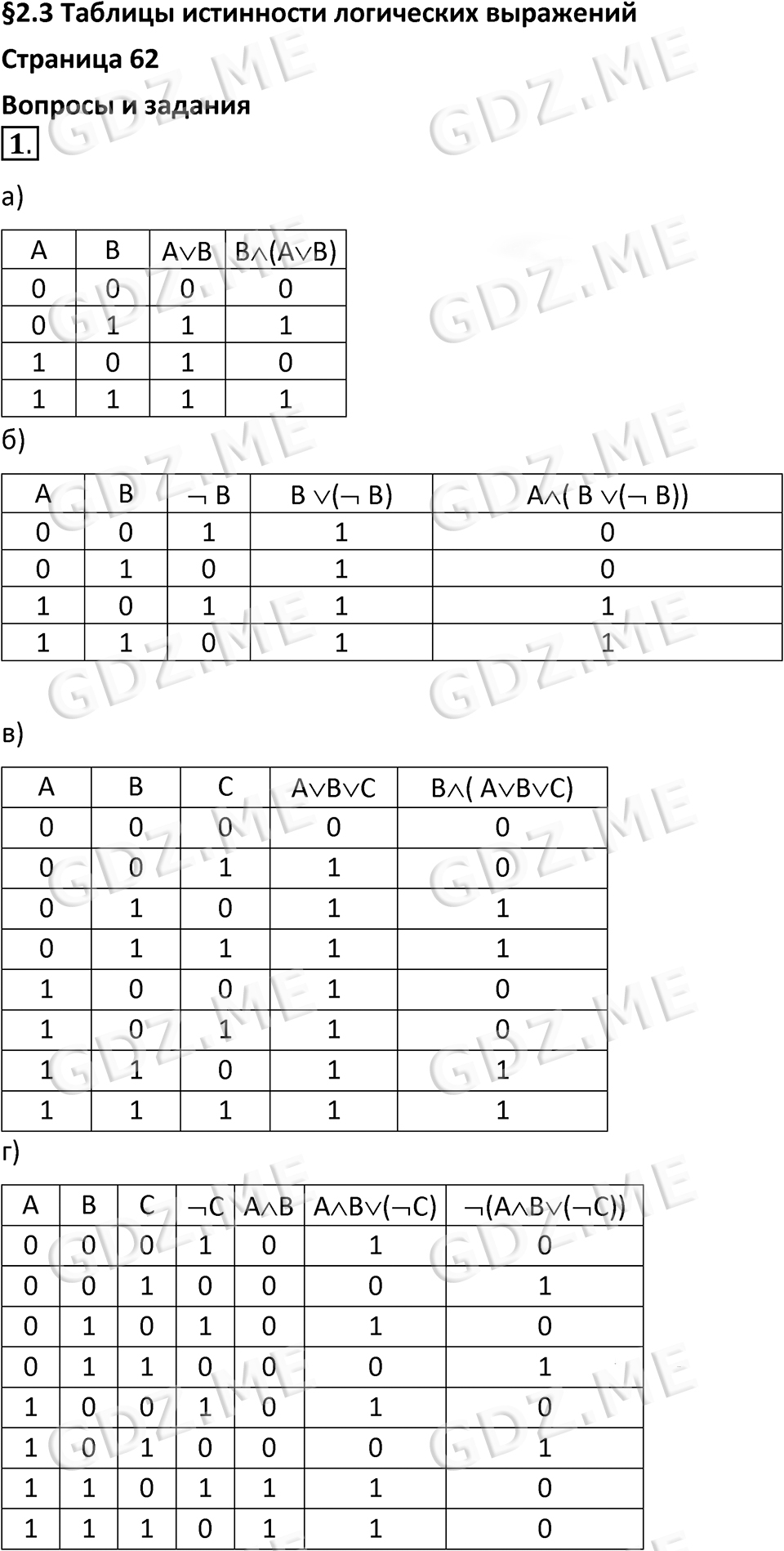 1 2 3 4 5 6 7 8 9 10§2.3. Таблицы истинности логических выражений. Страница 62. Вопросы и задания: